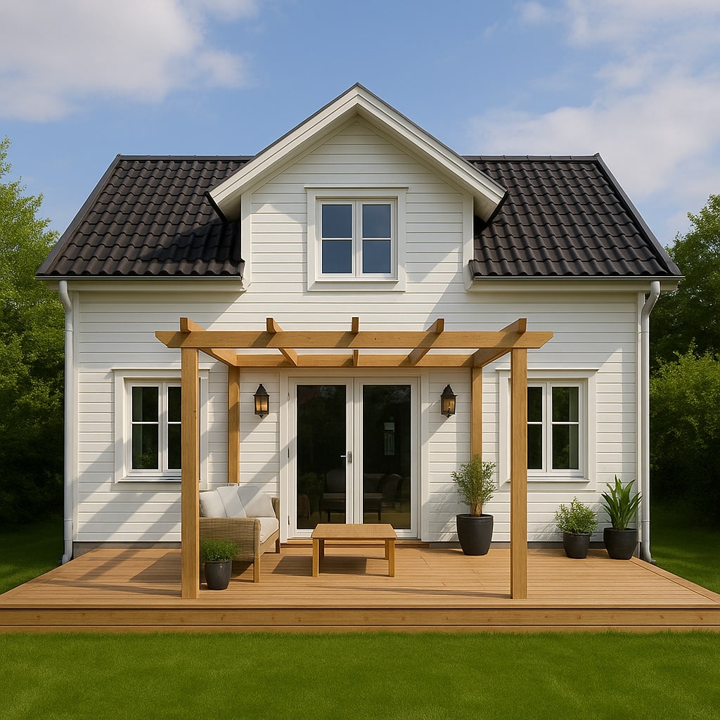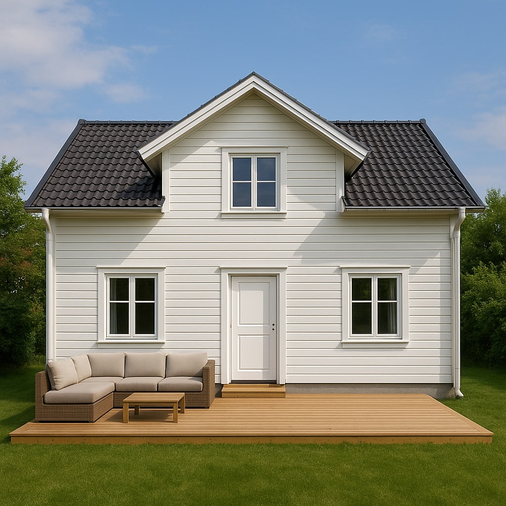 AI-gerðar myndir af palli við hús með liggjandi klæðningu.