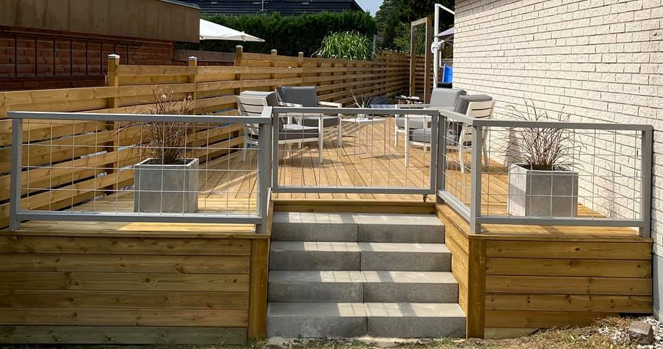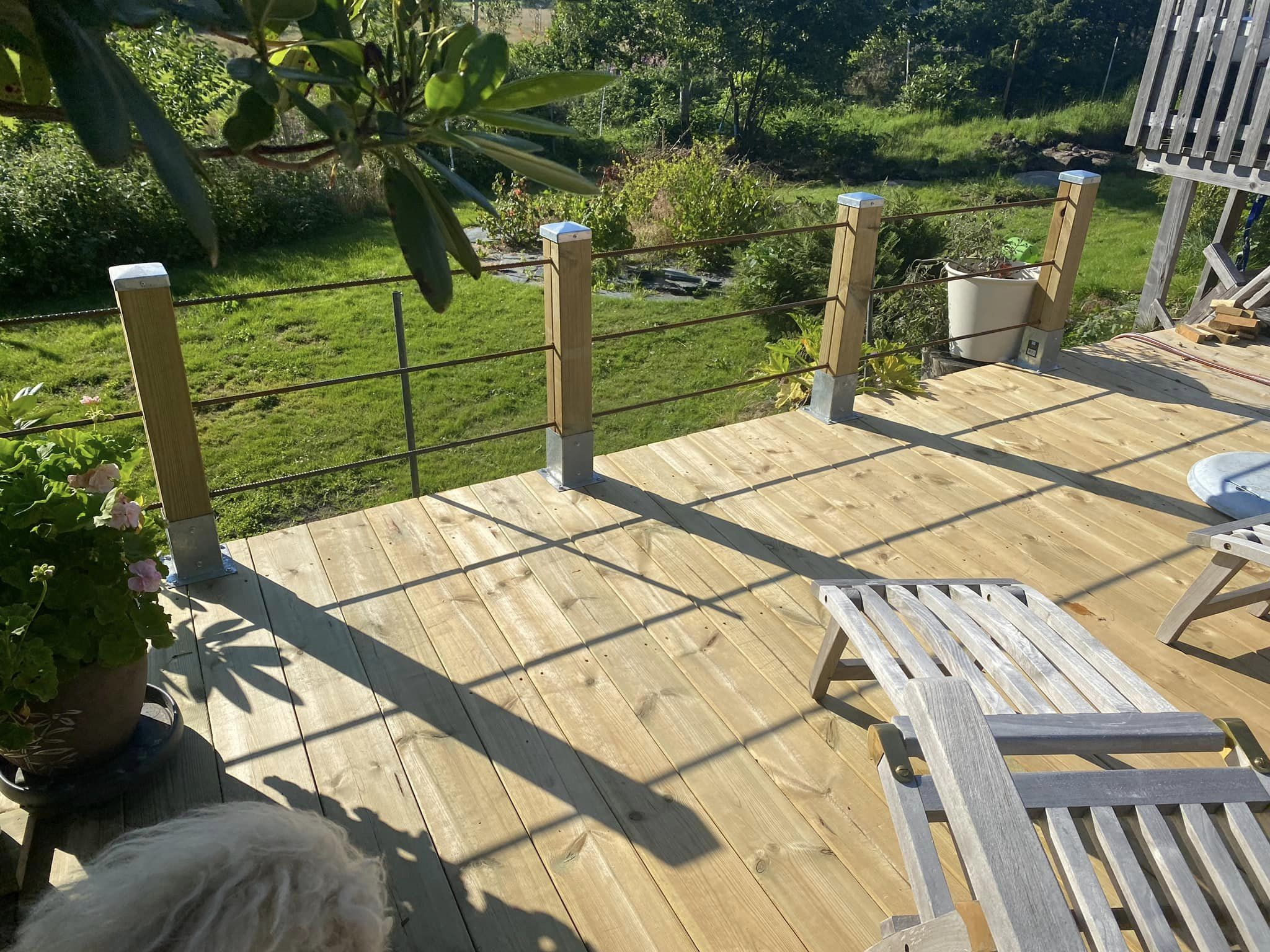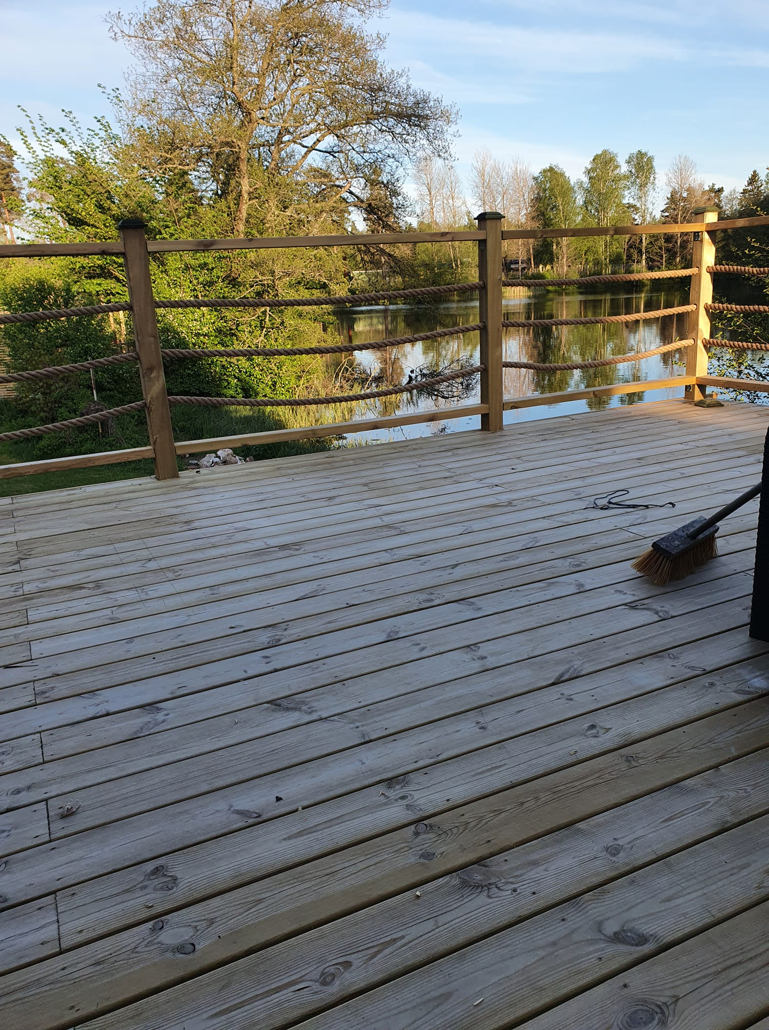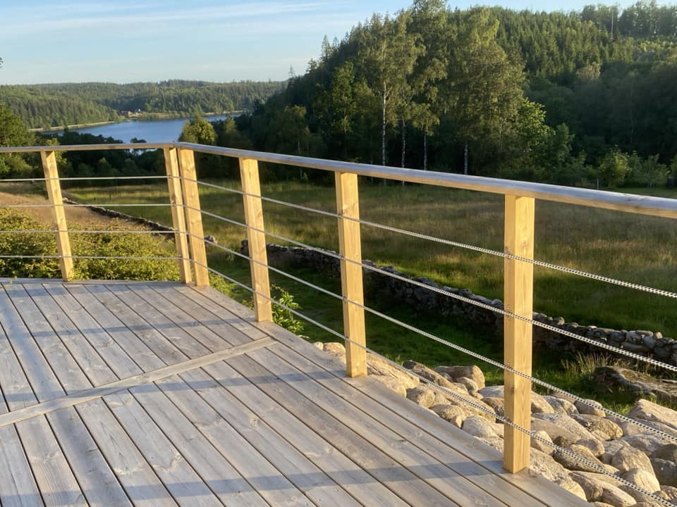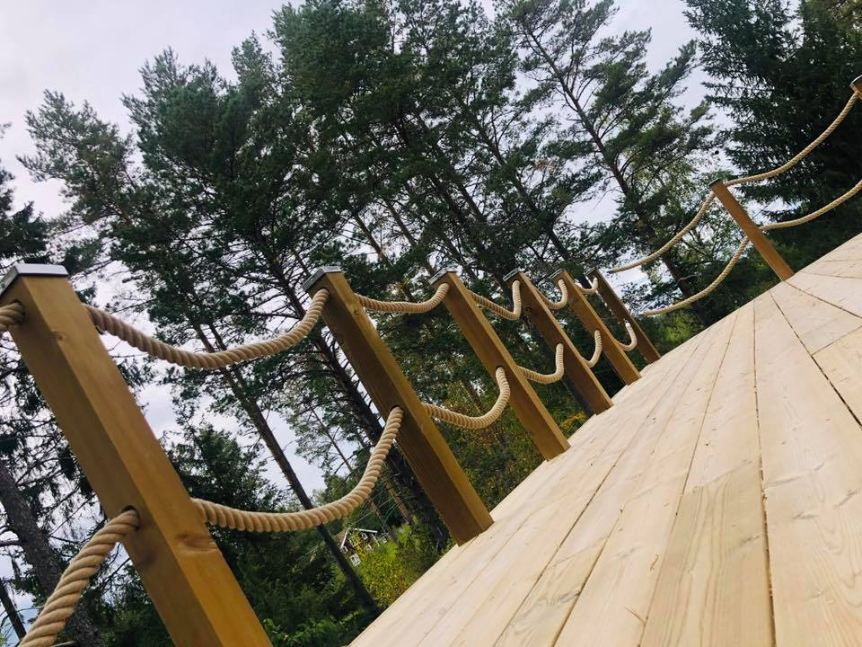 Handrið úr reipi gefur pallinum einstaka og afslappaða tilfinningu, fullkomið fyrir umhverfi nálægt sjó eða náttúru.