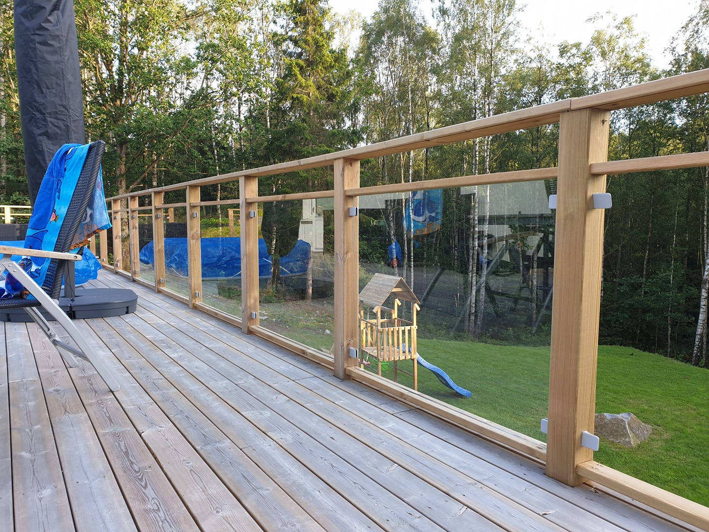 Handrið með gleri gefur pallinum glæsilegt og nútímalegt útlit.